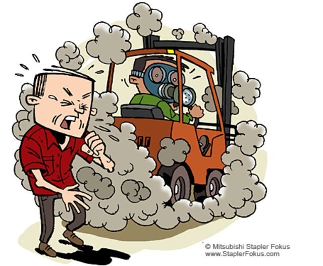 Im Allgemeinen produzieren Gabelstapler-Motoren keinen Staub – ein Gasmotor mit einem Dreiwege-Katalysator rußt nicht einmal. Das Problem ist vielmehr die Art und Weise, wie sie den vorhandenen Staub verteilen.
