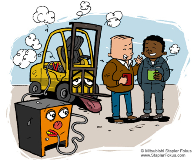 Es ist verlockend, den Gabelstapler während Pausenzeiten schnell aufzuladen. In der Branche nennt man diese schlechte Angewohnheit „Gelegenheitsaufladen“. Die Lebensdauer einer Batterie wird durch ihre Ladezyklen bestimmt (d. h. wie viele Aufladungen sie hinter sich hat). Kurze Aufladungen führen zu einer stetig abnehmenden Batterieeffizienz – bis zu dem Punkt, an dem sie schließlich gar nicht mehr aufgeladen werden kann. Gönnen Sie Ihrem Gabelstapler während Leerlaufzeiten stattdessen eine Abkühlung.